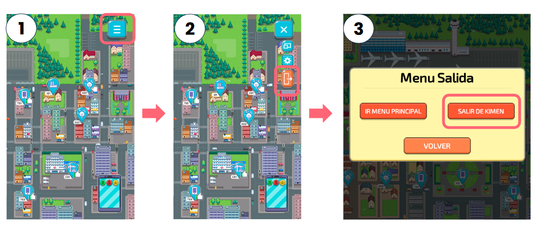 - Es muy importante que cierres de manera correcta, desde el botón de Menú, luego clic al botón naranja con la flecha y finalmente salir de Kimen (imagen adjunta).